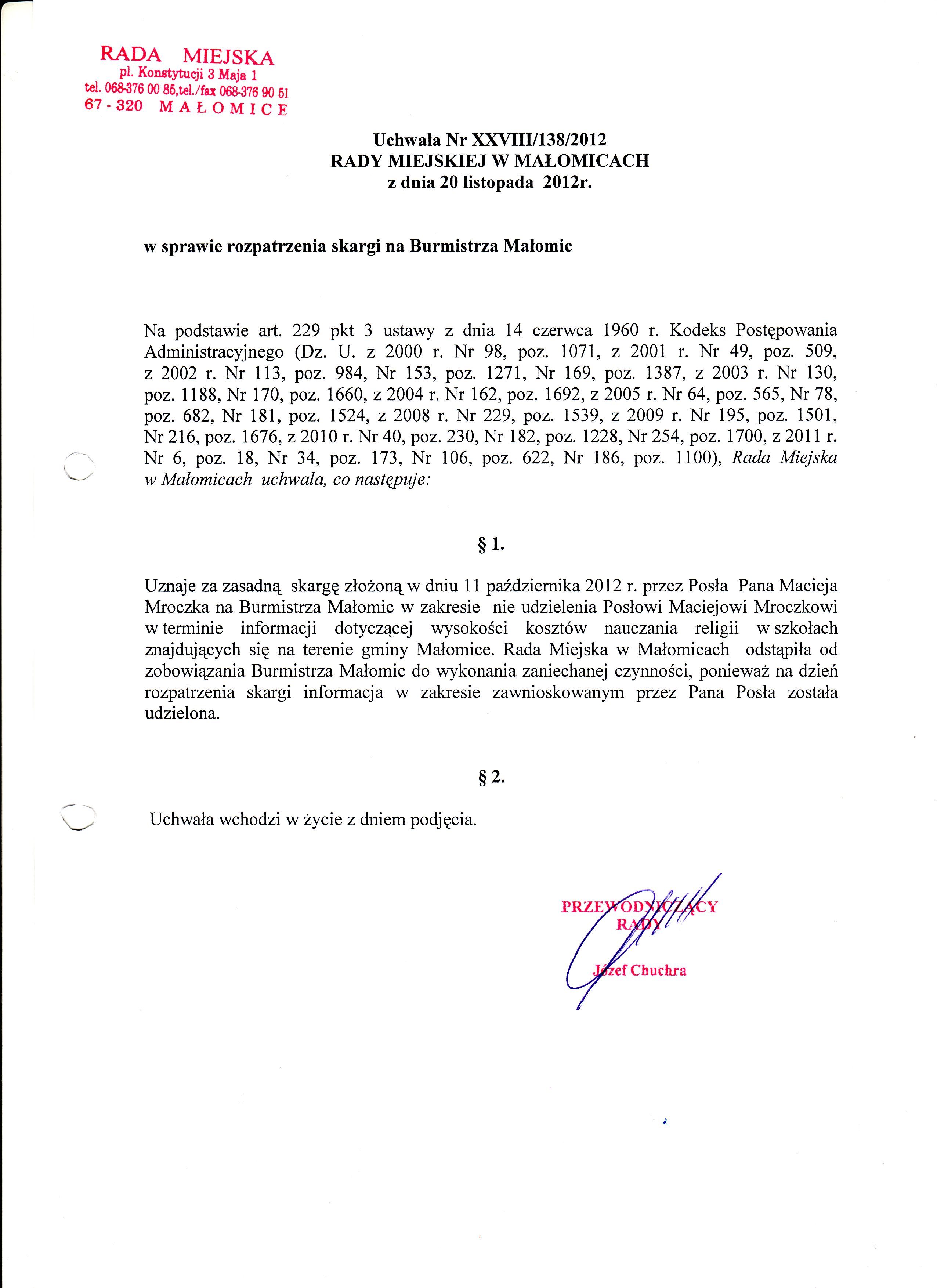 | XXVIII/138/2012 | w sprawie rozpatrzenia skargi na Burmistrza Małomic | 20.11.2012 | 20.11.2012 | pobierz |