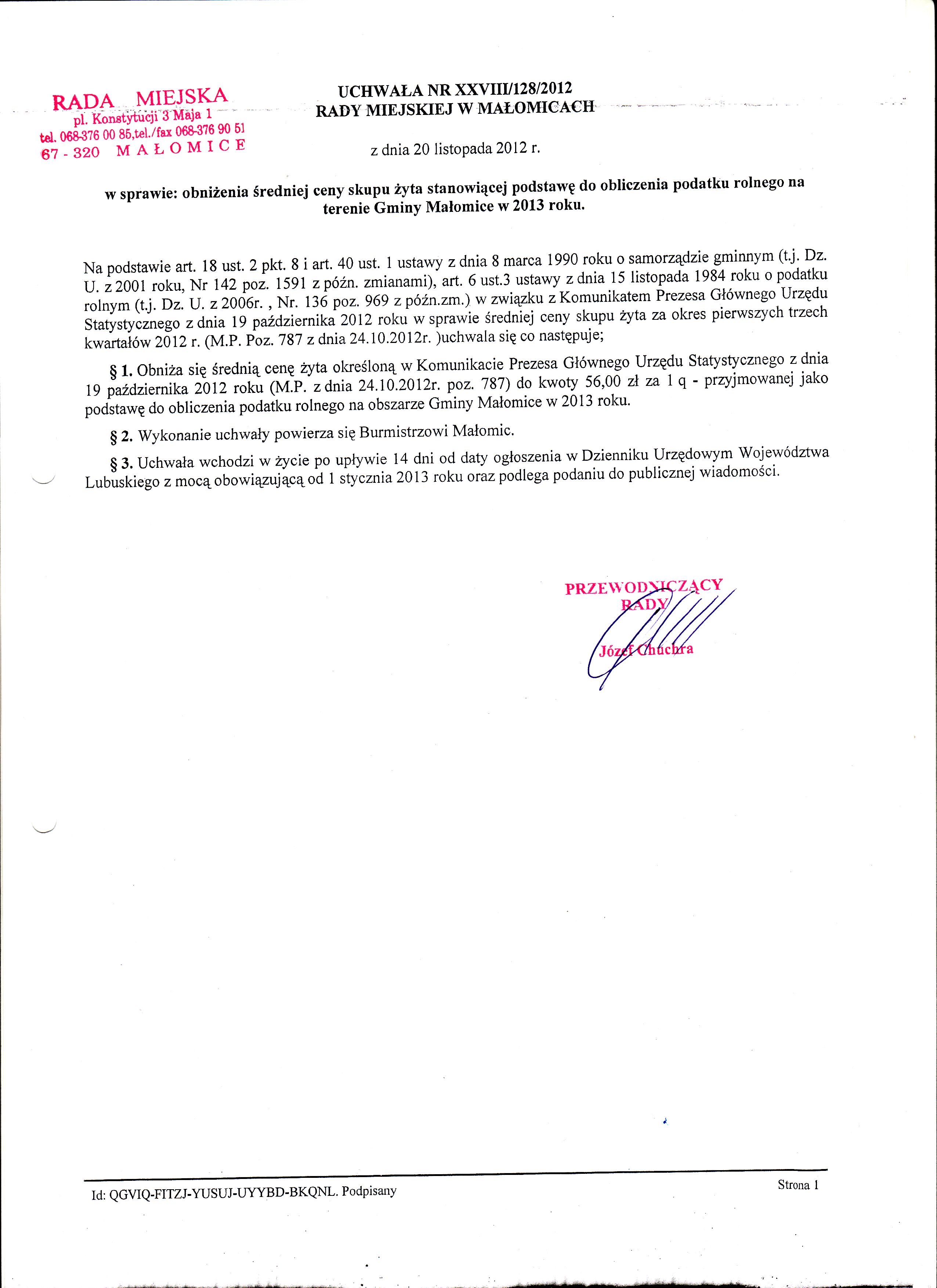 | XXVIII/128/2012 | w sprawie obnżenia średniej ceny skupu żyta stanowiącej podstawę do obliczenia podatku rolnego na terenie Gminy Małomice w 2013r. | 20.11.2012 | po upływie 14dni od dnia ogłoszenia w Dz.U.Woj.Lubuskiego z mocą obowiązującą od 1 stycznia 2013r | pobierz |