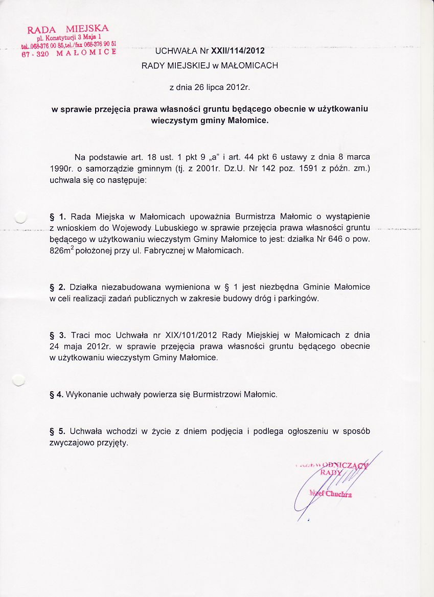 | XXII/114/2012 | w sprawie przejęcia prawa własności gruntu będącego obecnie w użytkowaniu wieczystym gminy Małomice. | 26.07.2012 | 26.07.2012 | pobierz |