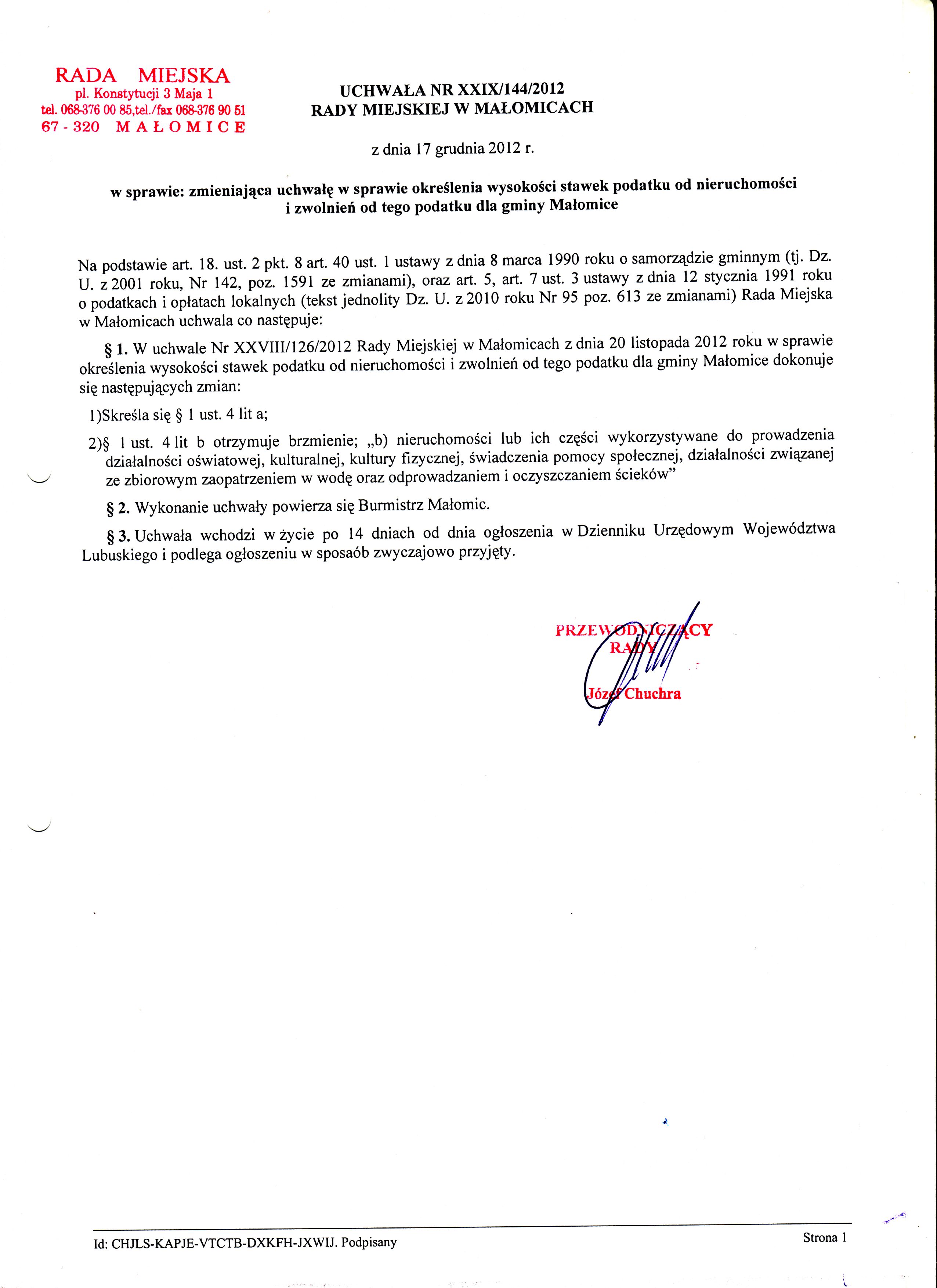 | XXIX/144/2012 | w sprawie zmieniająca uchwałę w sprawie określenia wysokości stawek podatku od nieruchomości i zwolnień od tego podatku dla gminy Małomice. | 17.12.2012 | po upływie 14dni od dnia ogłoszenia w Dz.U.Woj.Lubuskiego | pobierz |