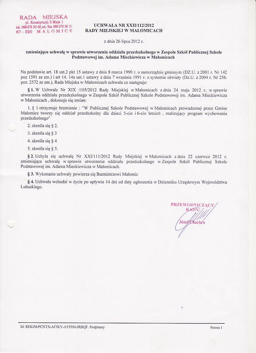 | XIX/105/2012 | w sprawie utworzenia oddziału przedszkolnego w Zespole Szkół Publicznej Szkole Podstawowej im.Adama Mickiewicza w Małomicach. | 24.05.2012 | 24.05.2012 | pobierz |